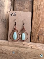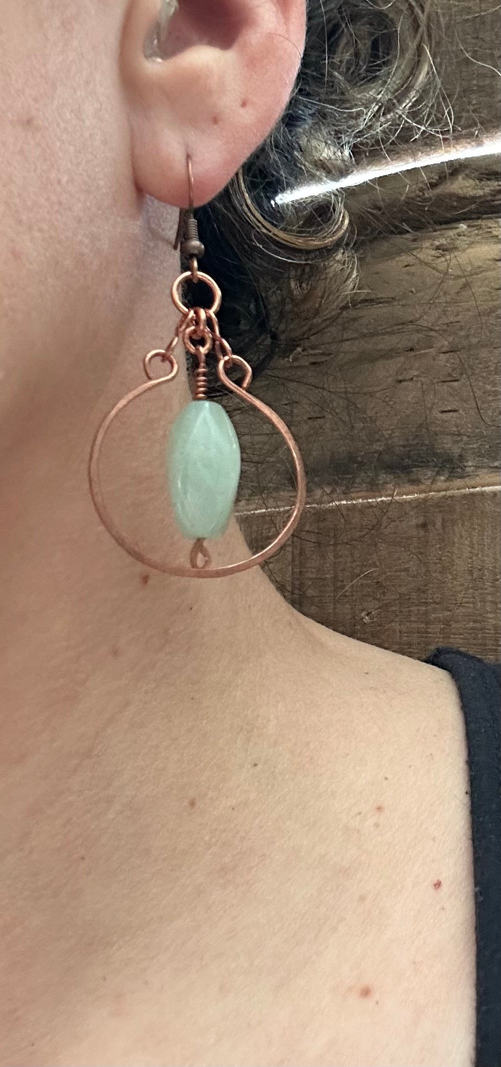 Handcrafted with warm copper wire, these elegant statement earrings feature a smooth 20 x 10 mm oval of soft green aventurine. The stone is suspended within a hand-shaped copper frame, creating a fluid, organic silhouette that moves beautifully with the wearer.
