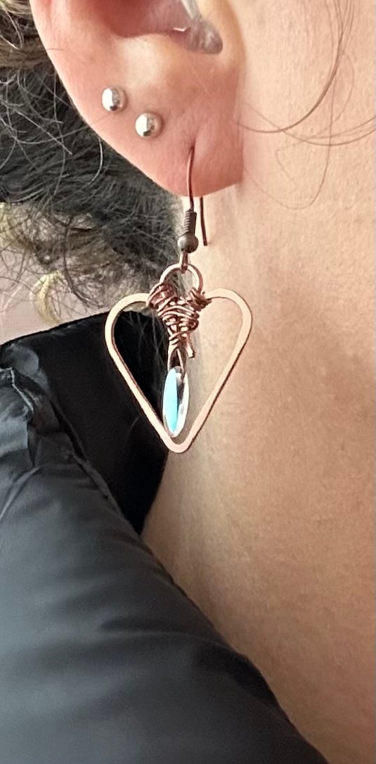 Add a touch of warmth and elegance to your look with these handcrafted copper heart earrings. Each pair features a softly hammered open heart design, carefully wire-wrapped by hand, and finished with a shimmering glass drop bead that catches the light beautifully.